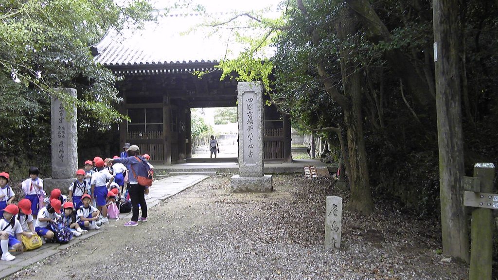 屋島登山道を登り切ったところが屋島寺山門。小学生は登山道で登って来たのだろうか。