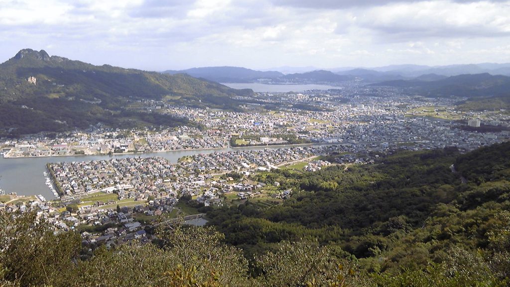 これから歩く東側斜面の下には、入江をはさんで市街地が広がっており、家々がすきまなく建て込んでいる。その向こうが五剣山で、特徴ある5つの頂上を現わしている。五剣山の北寄りの山麓が茶色に削られているのは、採石場になってしまったのだろうか。