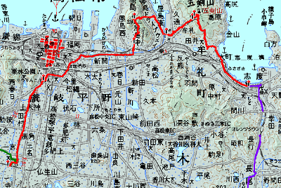 [行 程](高松→)琴電一宮 6:55 →(5.9km)8:20 栗林公園前マクドナルド 8:45 →(6.9km)10:35 屋島登山口下休憩所 10:45 →(1.7km)11:55 屋島寺 12:30 →