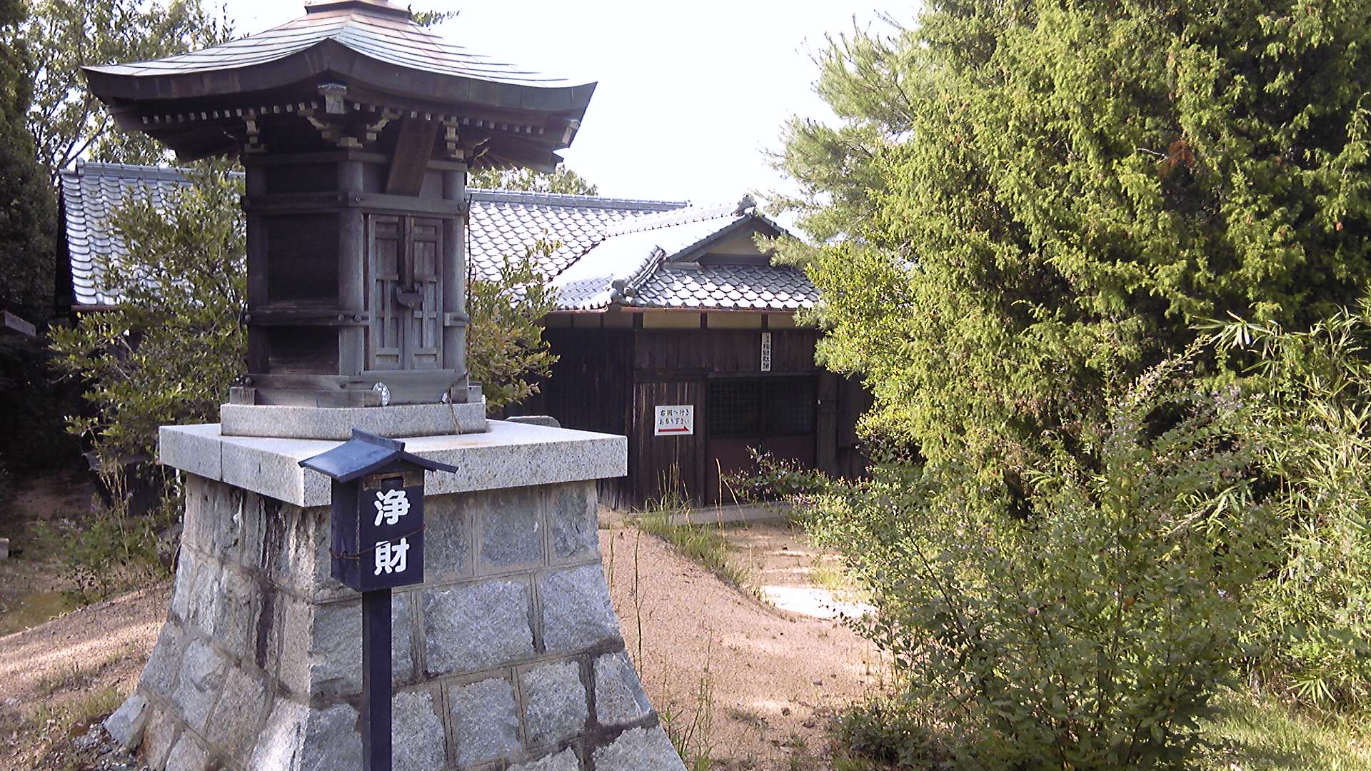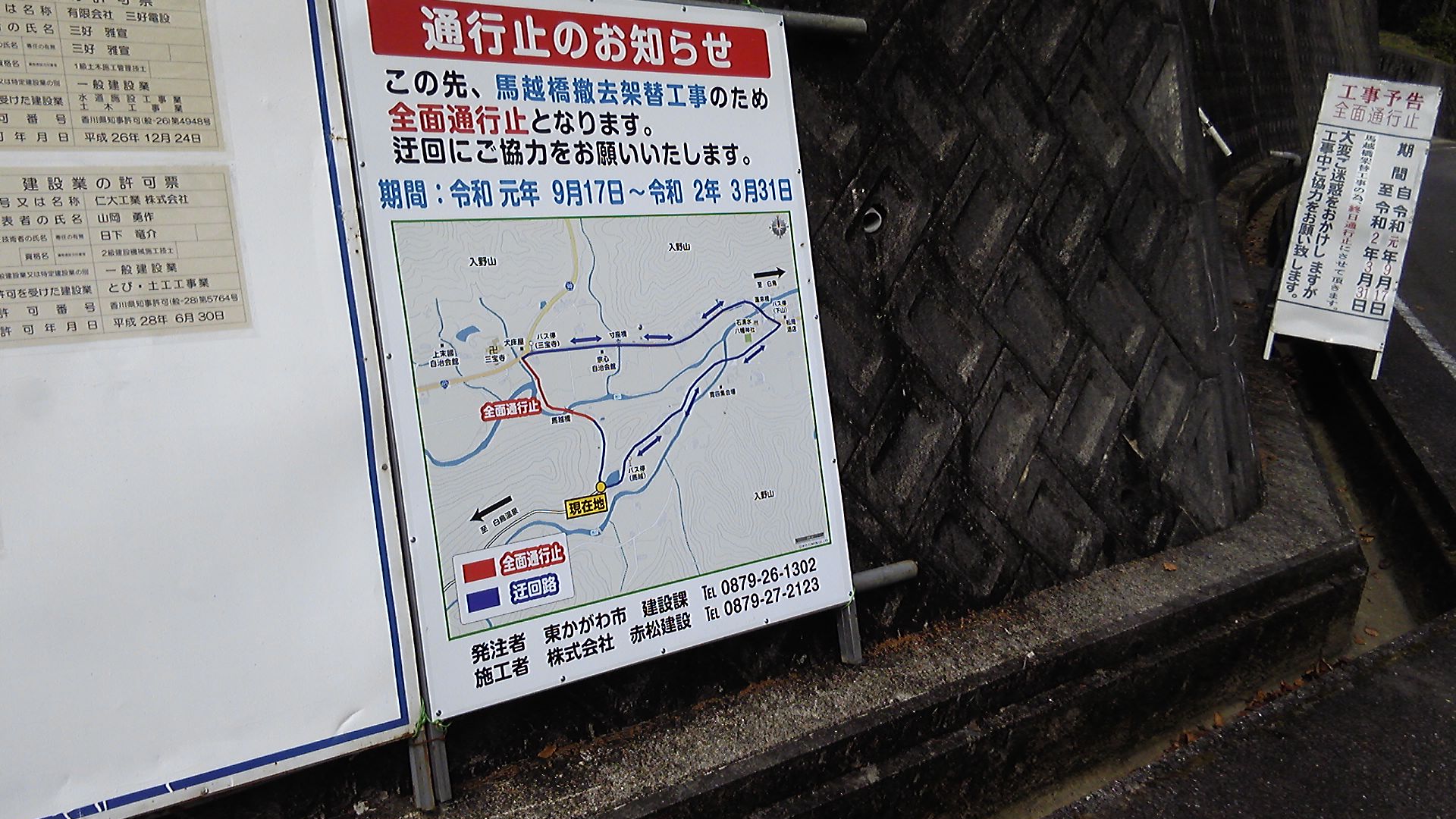 現在では、大麻町の肉店が所有者で、「四国のみち探索、お不動様参拝の方、ご利用ください」と無料駐車場になっている。とはいえ、自動車は一台も止まっていない。その代わりに、大麻方面から登ってきたサイクリストが、そのまま引き返したり自転車に乗ったまま一休みしたりしていた。