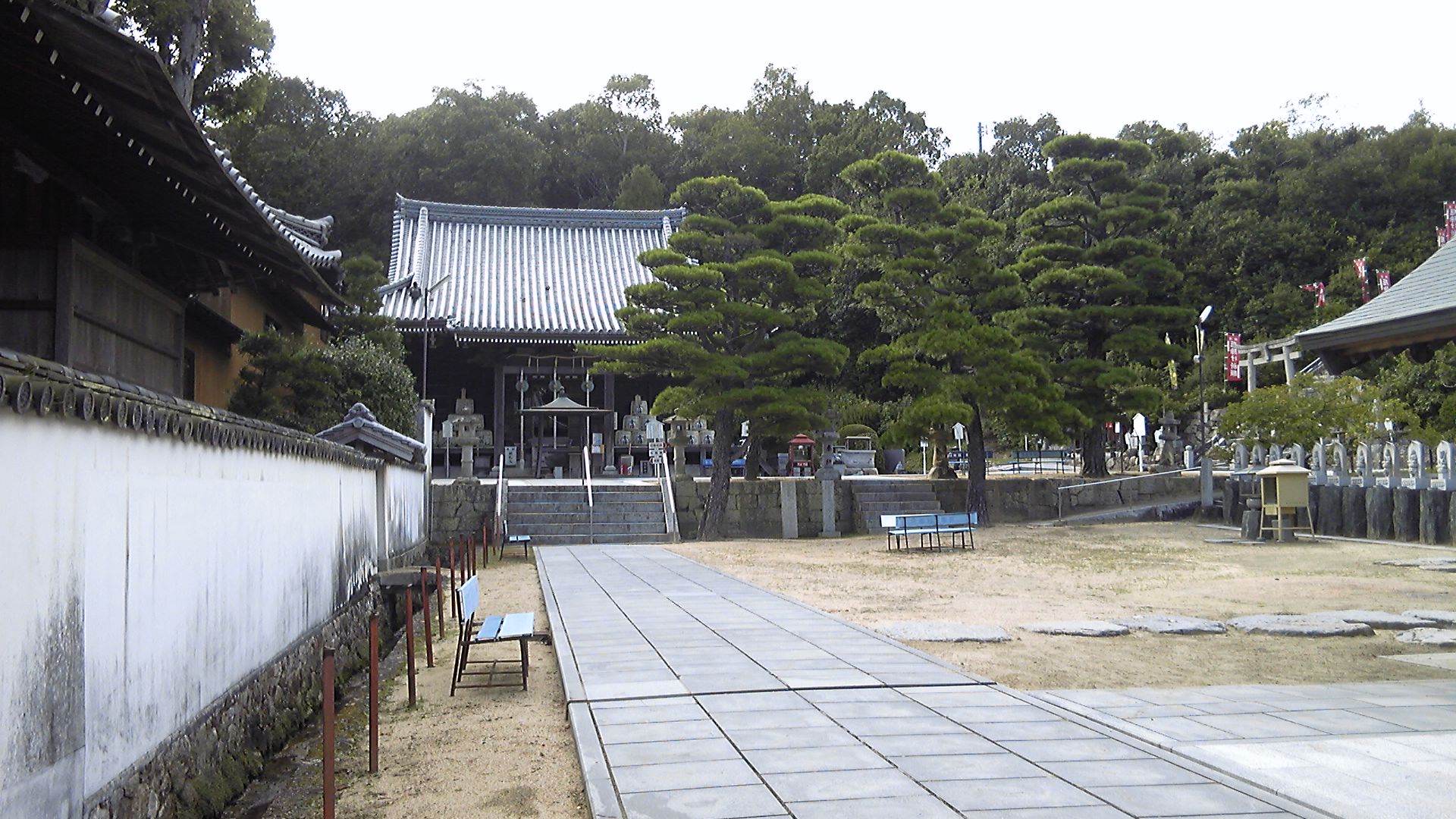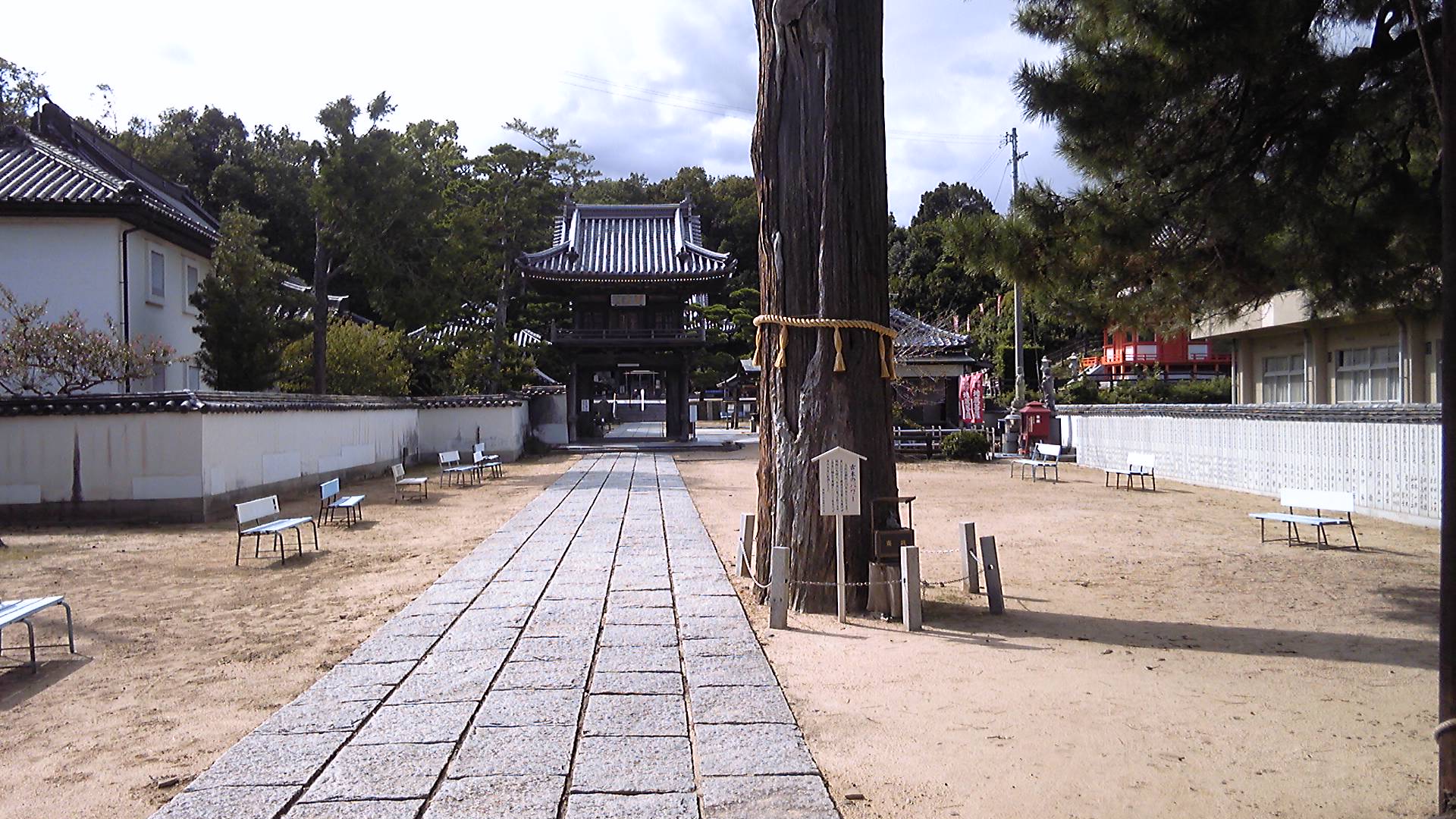 大麻比古神社から霊山寺まではまっすぐ南に進むだけだが、この参道がかなり長い。道の両脇には石灯籠が続き、林の向こうには大きな旅館の建物も見える。大日寺隣の一宮神社よりも、規模としては大麻比古神社の方がかなり大きい。