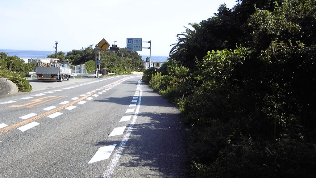 ようやく海岸線に近づく。簡易舗装されているが、かなりの急傾斜が麓まで続く。