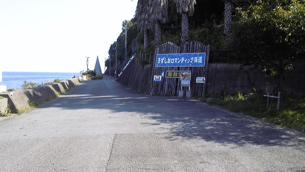 10分ほど休んで出発。三津トンネルの横には海岸線に沿って、「うずしおロマンティック海道」というアート作品の路上展示がある。この道はトンネル開通前は国道で、いまでも国道表示の古い標識が残っている。