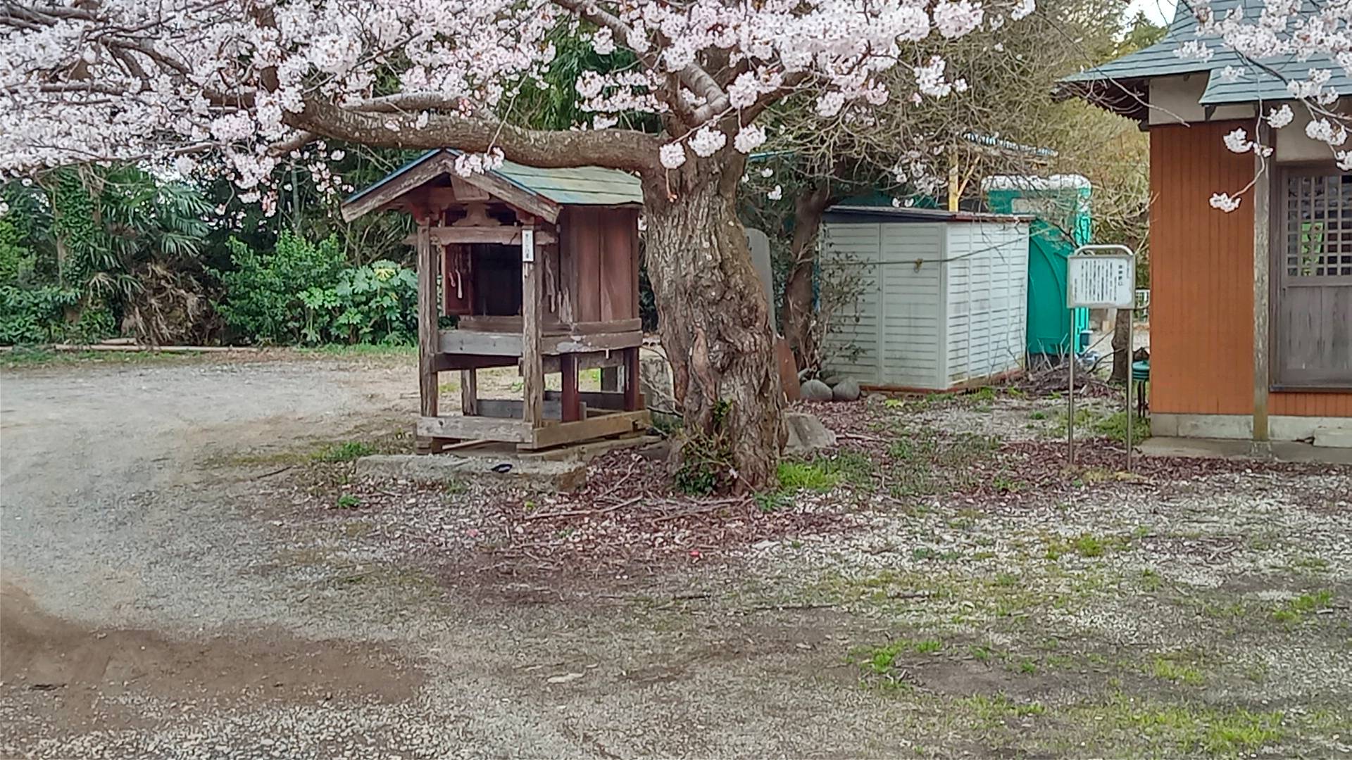 稲荷神社にお参りした後、駐車場と拝殿の間にある神宮寺札所にお参りする。ここには、札所のお堂の隣に客神の神社が祀られている。桜の花が満開である。