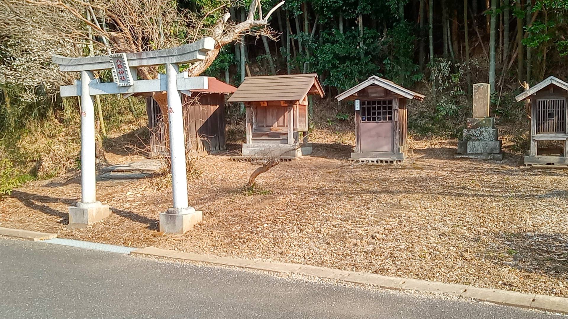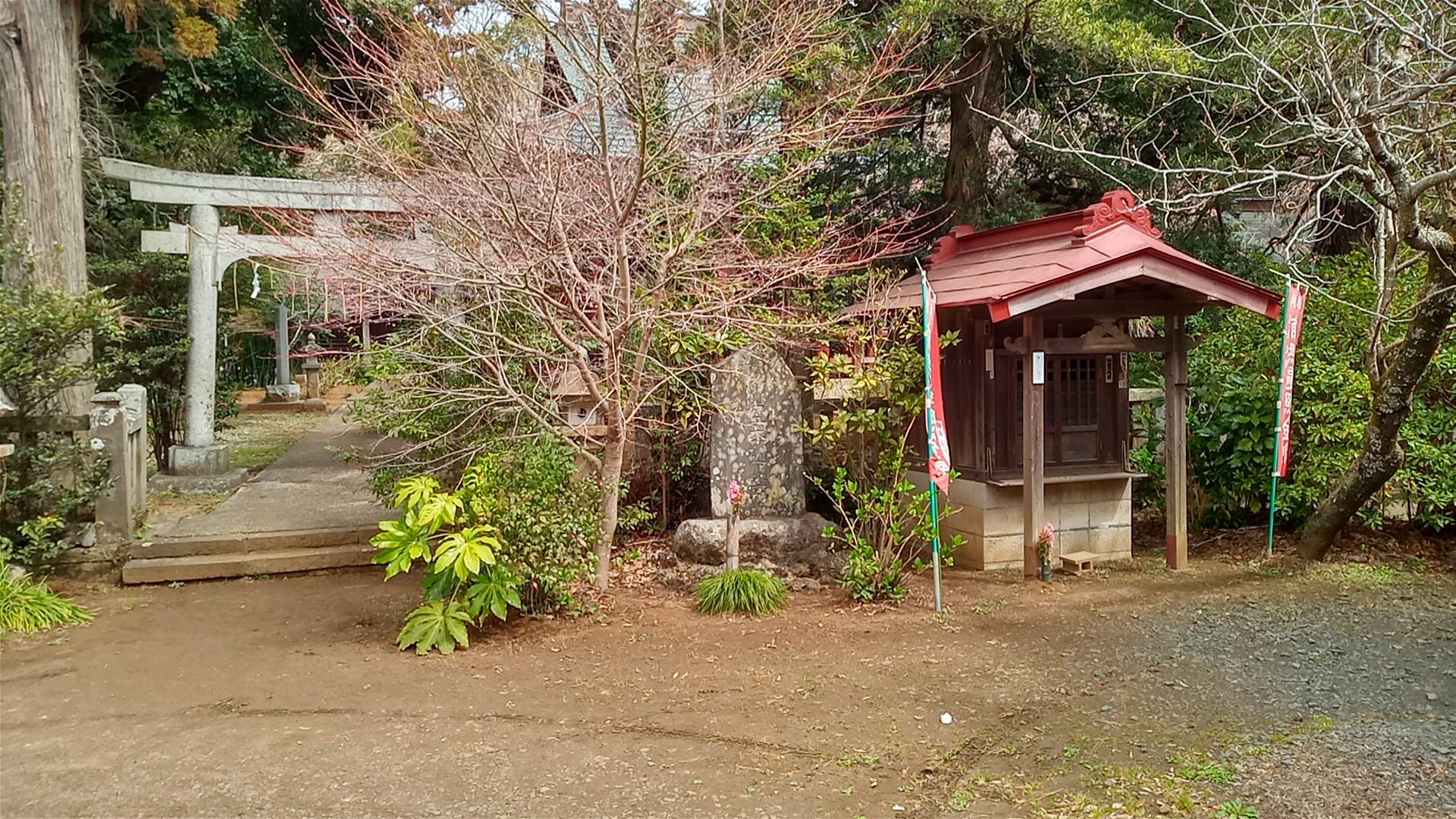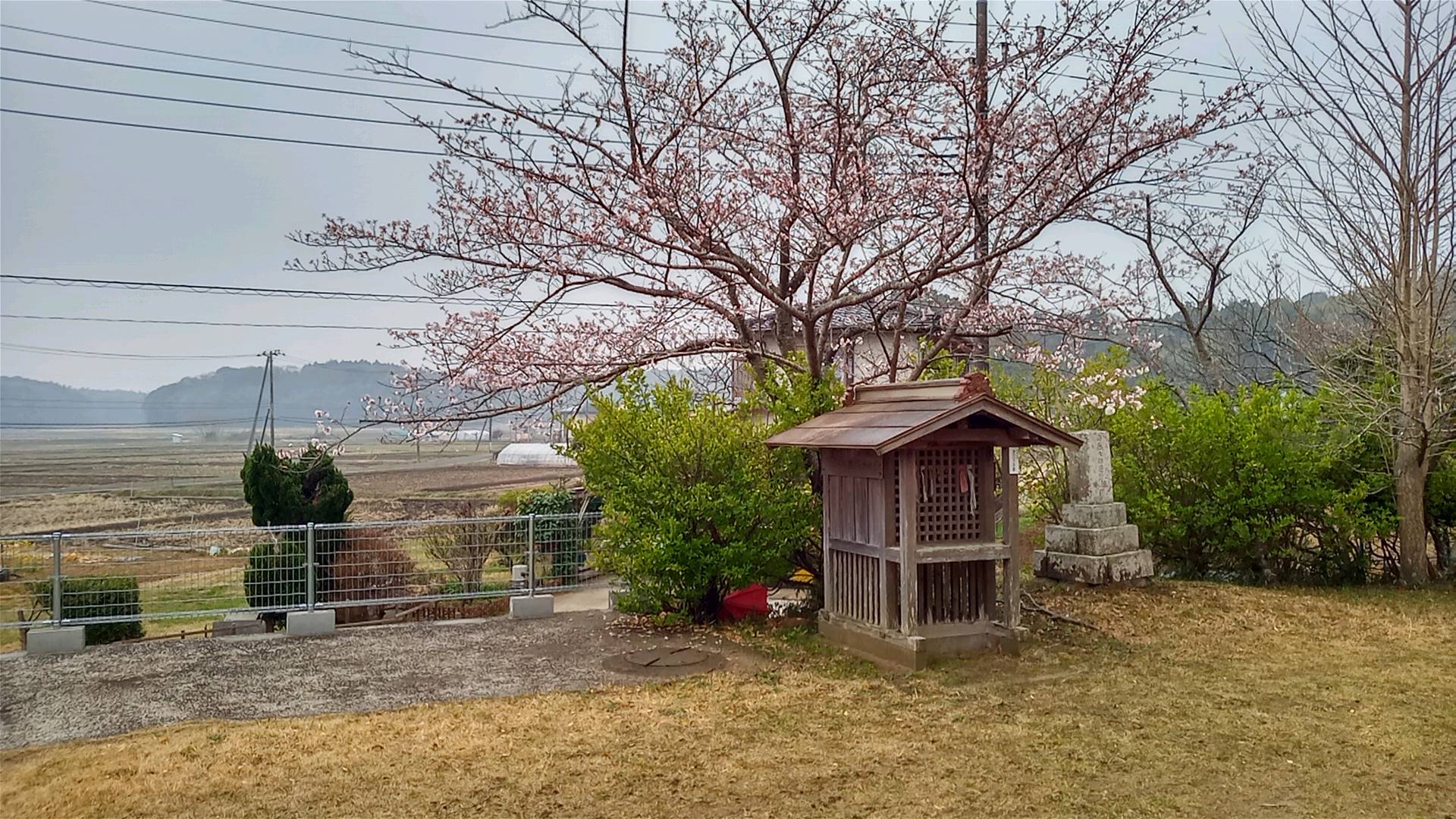 ただ、畑の向こうにそれらしき建物が見えたので行ってみると、はたしてプレートが貼ってあった。桜の大木と神社、奥に観音堂と思われるお堂と、札所の小堂がある。神社はお神輿を大きくしたような立派なものだが、Googleには載っていない。