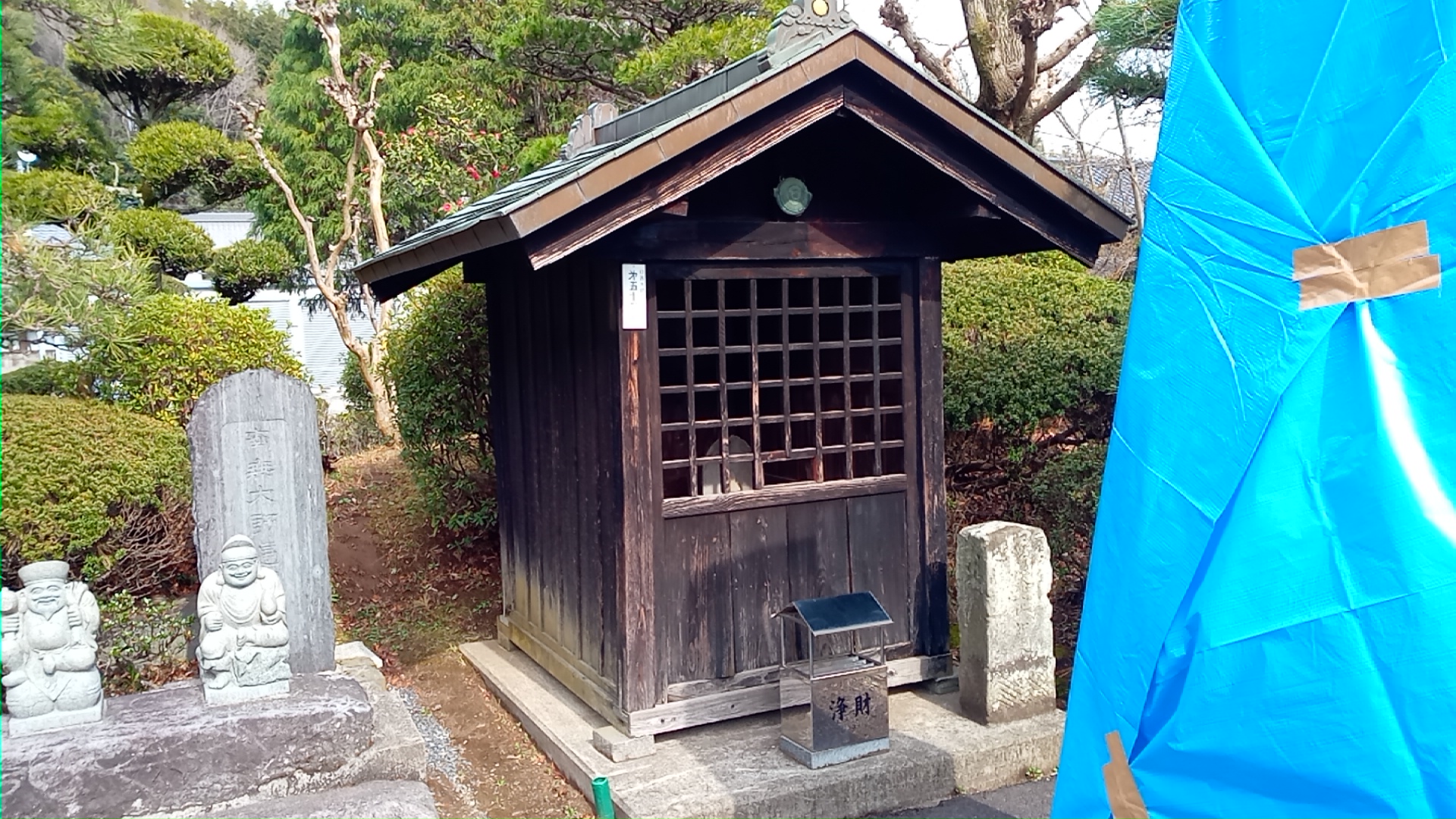 迎福寺境内の五十三番札所。前のブルーシートは灯篭か何かを養生していると思われる。