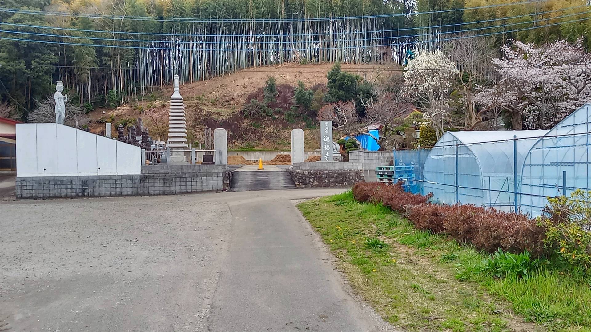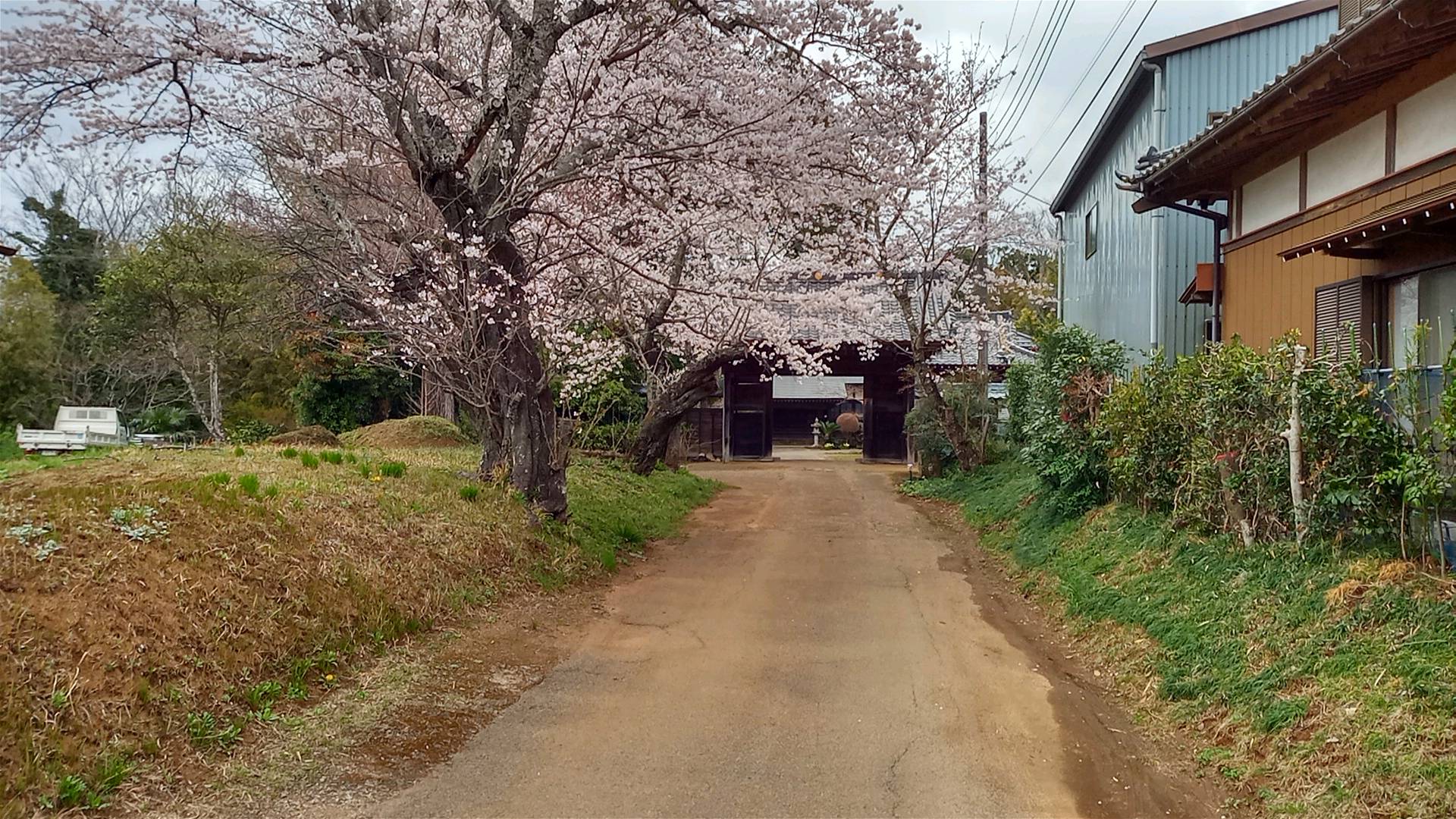 「来福寺→」の案内看板を入ると、お寺が見えてくる。こちらも桜が満開だ。そして、遠目に見ても広い境内であることが分かる。さすが、天台宗中本山の泉福寺が、「お大師様を祀るならあの寺に話をしておけ」と言っただけのことはある。