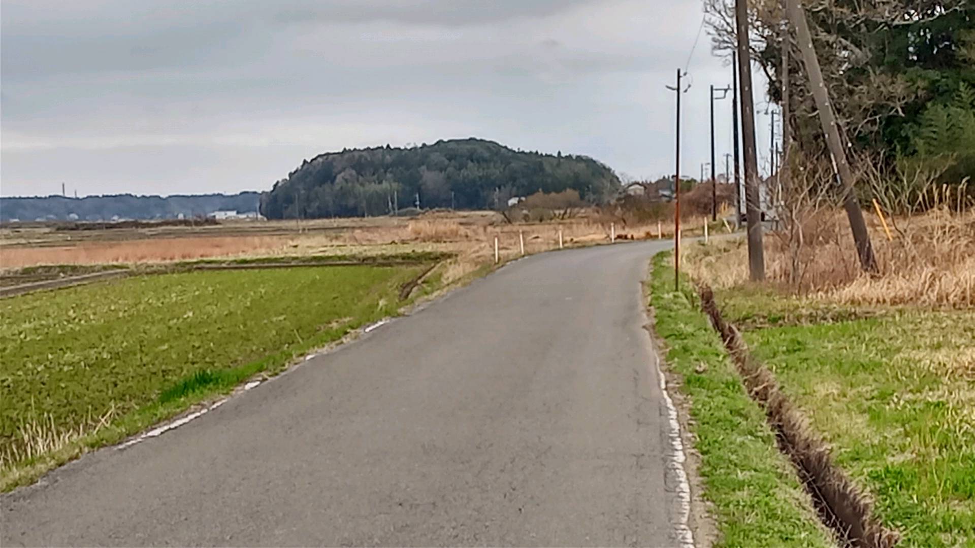 印旛沼捷水路を渡ってしばらくすると、左手は成田市街までさえぎるもののない低地で、なるほど百年前まで印旛沼だった地形なのだが、正面に小高い丘が見えている。1km以上先である。