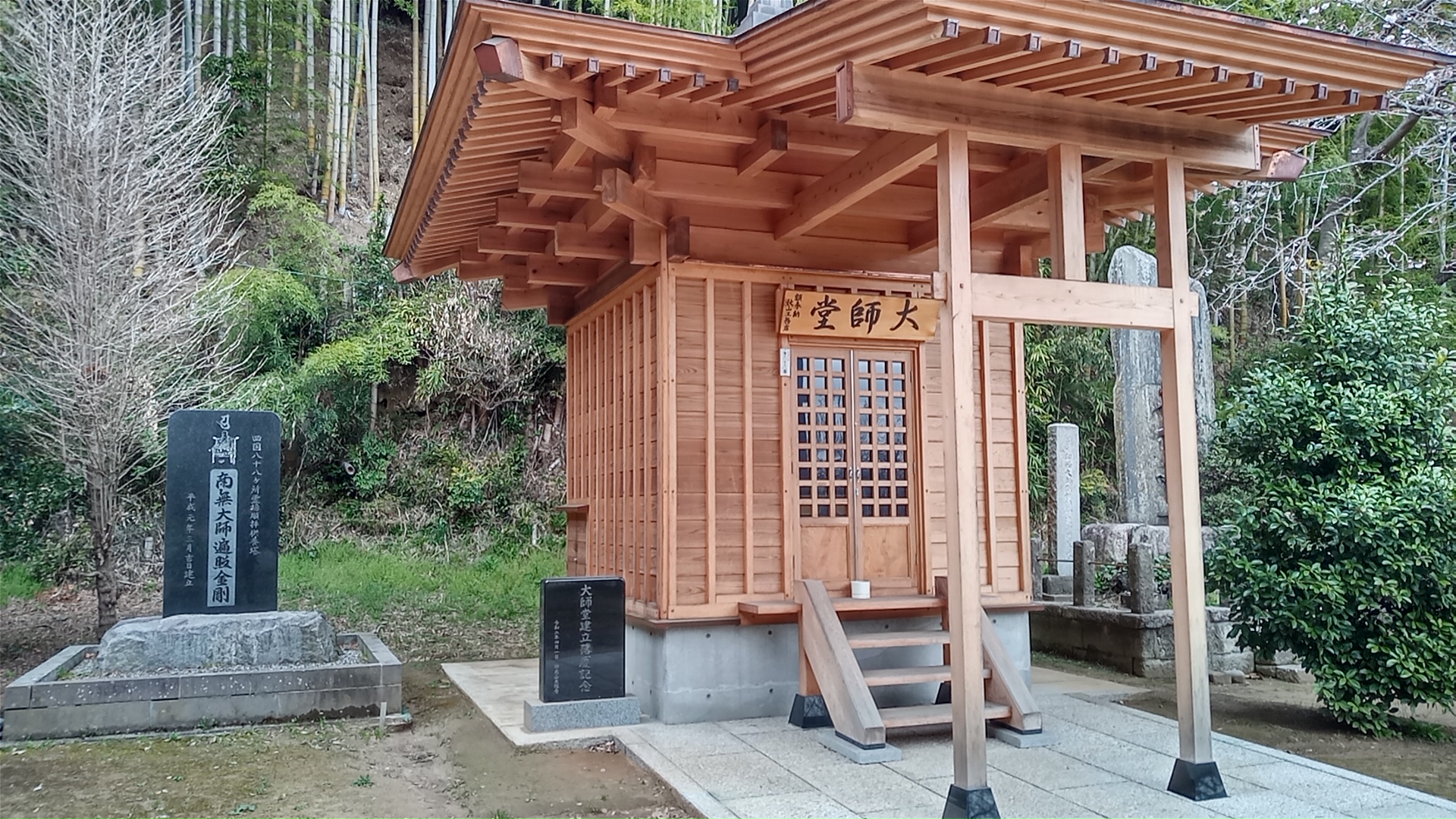 他の札所のように小堂ではなく、中に何人か入れるくらいのお堂にプレートが貼ってある。屋根の上に「大山」とあるのは、太山寺を意識したものだろうか。お堂の前には小堂があり、こちらにも石造りのお大師様がいらっしゃる。