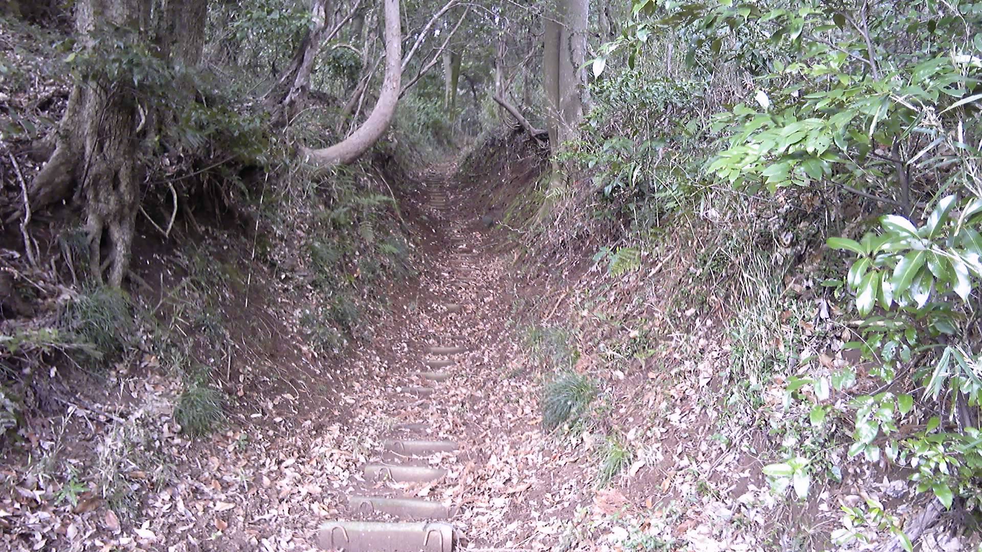 島の3分の2ほど回り込んだ頃、ようやく頂上への参道が見えてきた。鬱蒼とした林の中を登って行く。その割に、雑草が道をふさぐことがないのは、定期的に除草されているのであろう。標高差40~50m登ると、ようやくお宮が見えてきた。