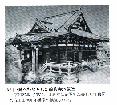 現在の竜腹寺延命地蔵尊は地元の人達だけが訪れる場所になっているけれど、第二次大戦以前はもっと大きなお堂であったという。というのは、江戸時代のお堂は、東京大空襲で焼失した深川の成田山別院に移築されたからである。現在の深川不動尊である。