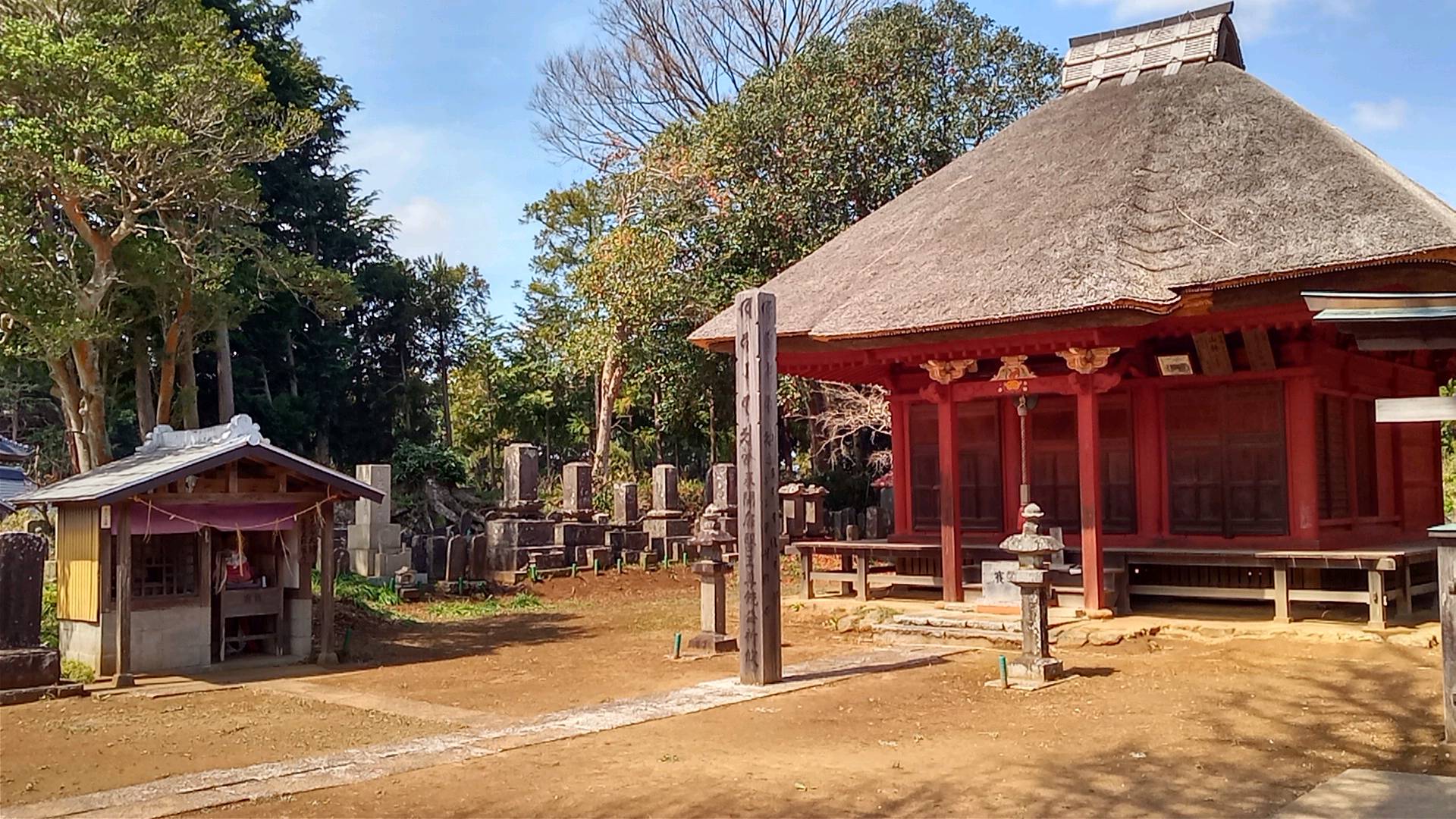 本堂はたいへん立派で、印西札所の中でも最大級の大きさである。道路に近い場所に七福神の福禄寿像と並んで、三十二番札所があり、横に集会所がある。本堂と離れているのは、お寺の所有地でないのだろうか。