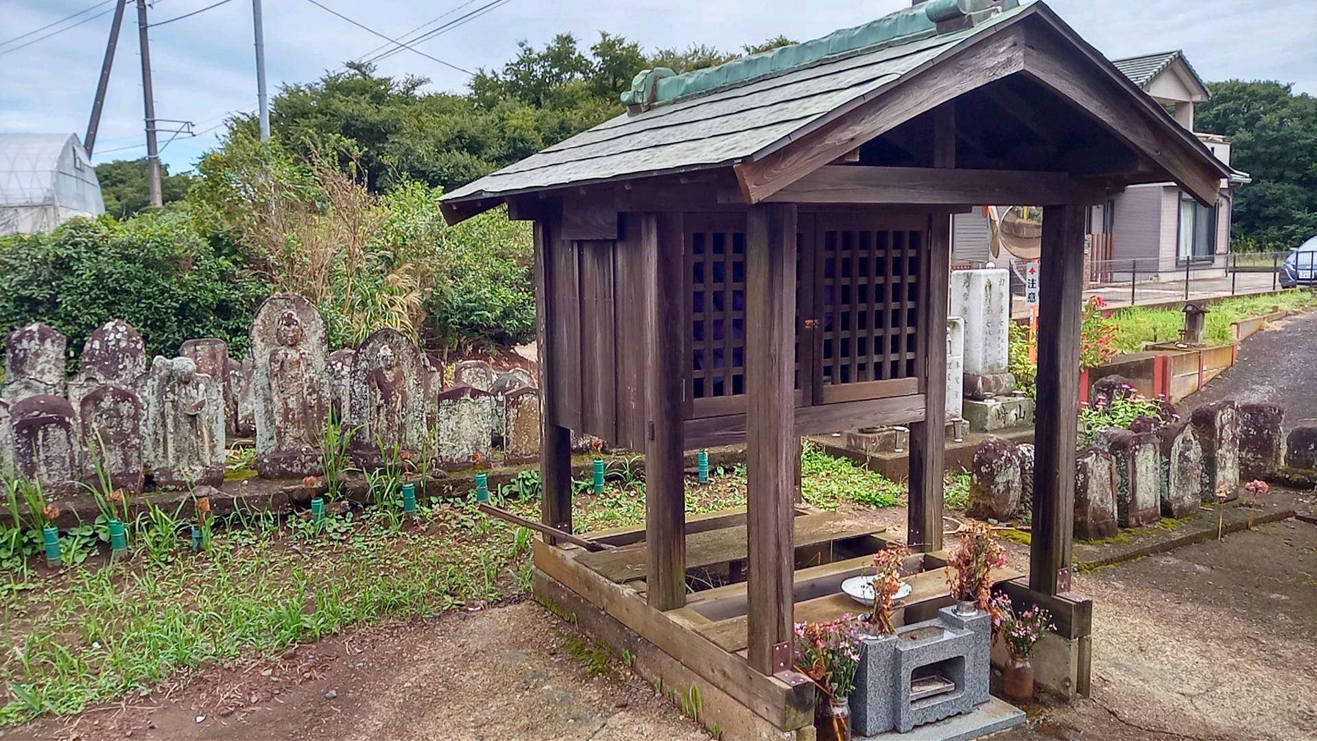 ご住職のお住まいも棟続きのようで、何台かの車が駐まっていた。植栽も手が込んでいて鮮やかである。門のところには庚申塔が整然と並べられ、いろいろなところに気を使っていることが分かる。