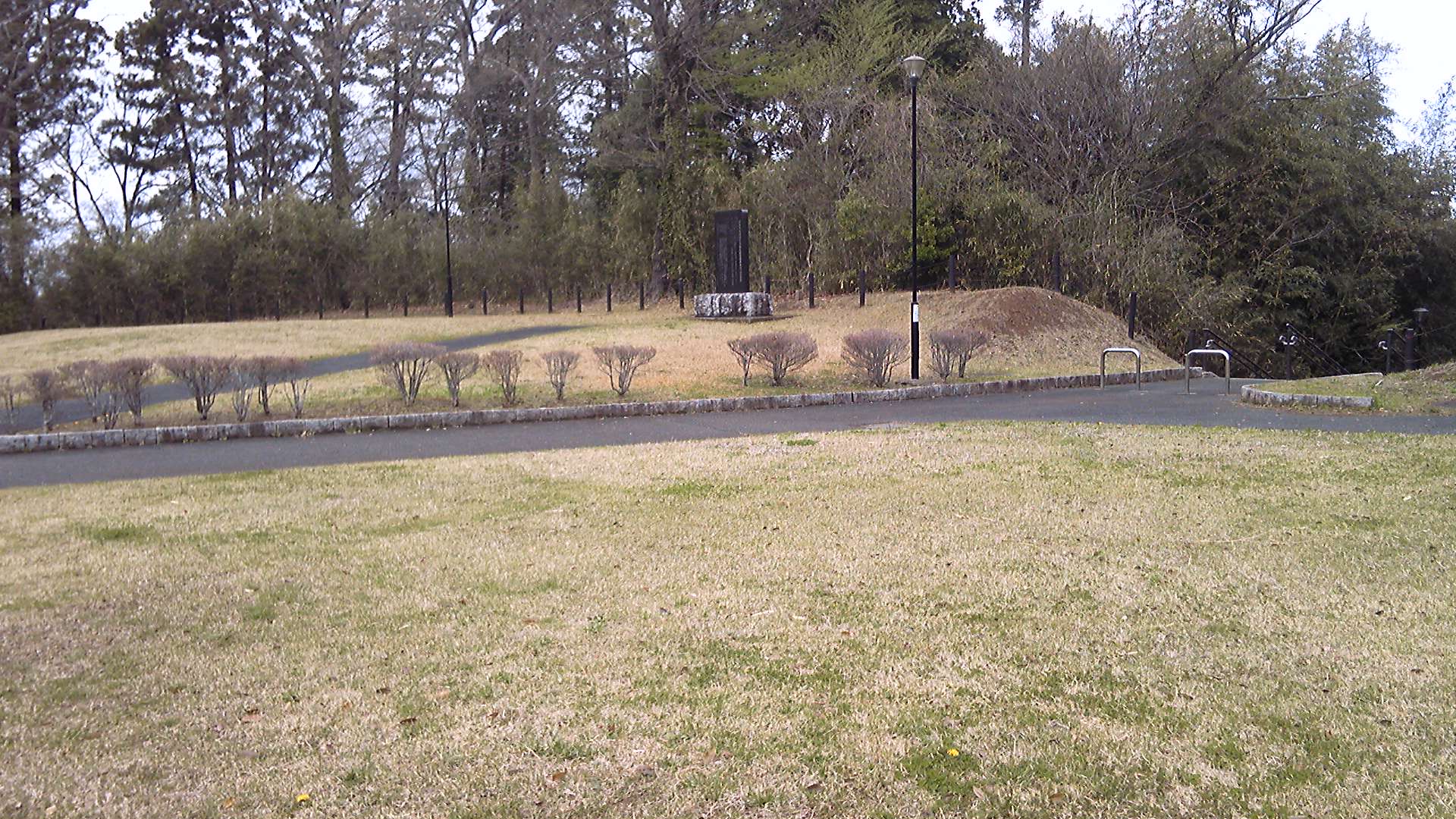 そのまま坂を下って西部公園へ。ここは、たまにお散歩で来るところである。前日までの雨でグラウンドには大きな水たまりができていた。この日は晴れ予報だが朝方のためかまだ雲が厚い。