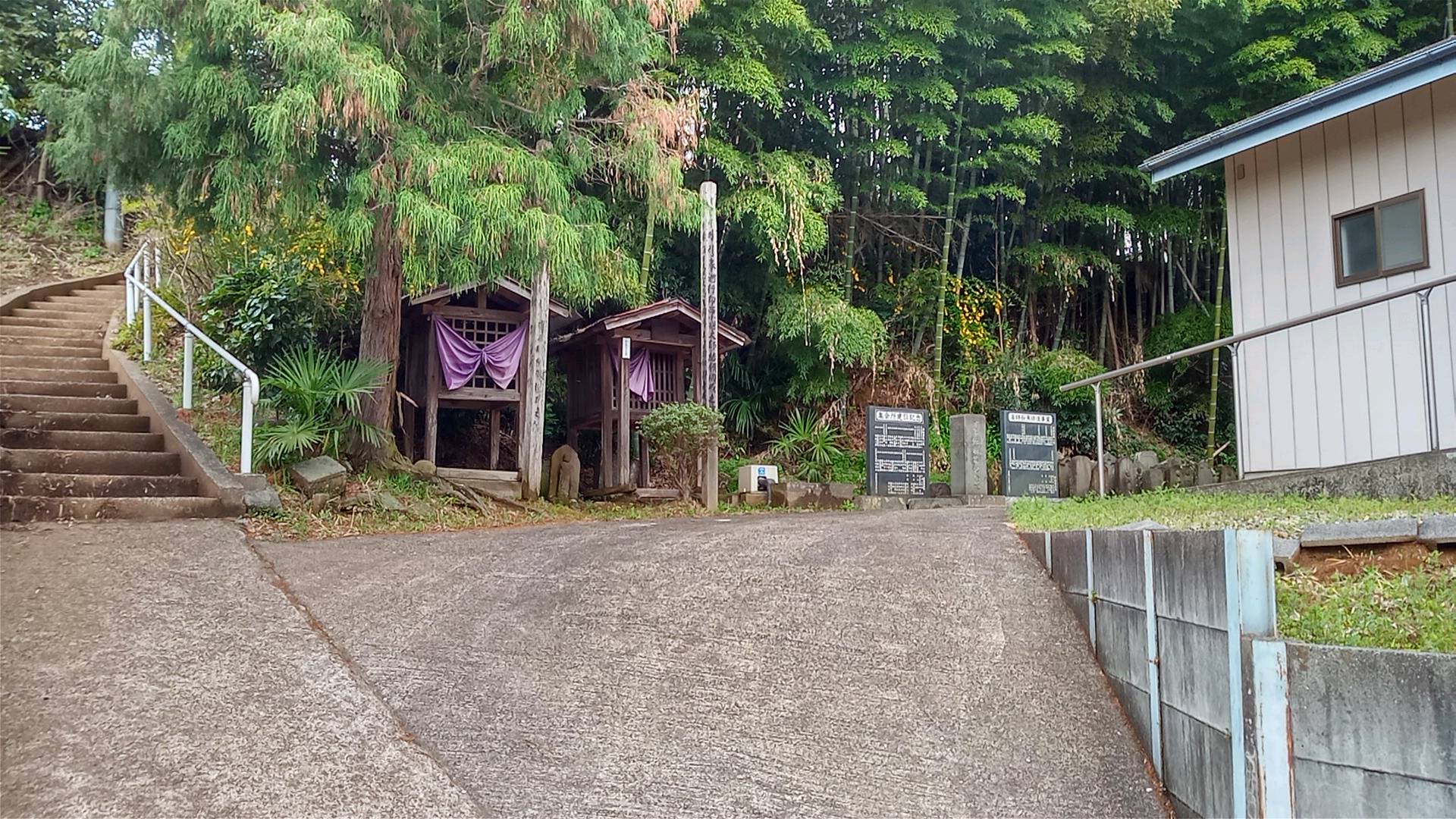 ところが、道路沿いの低くなった場所に、鉄骨で補強された古びた建物がそうだったのである。あれがそうだったのかと驚いた。歩いて行ってみると、街道から入る細い道の奥に、広い境内があった。