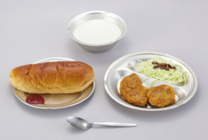 当時の食器はもっと黄色かったし、スプーンの先は割れていた。(出典:(公財)学校給食研究改善協会)