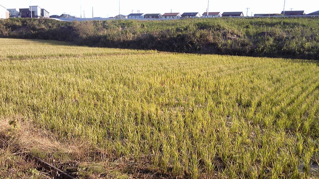 大雨の後で水田に行ってみると、ひこばえの稲が普段の年より盛大に実っていて、まるで刈り取り前のような景色だった。