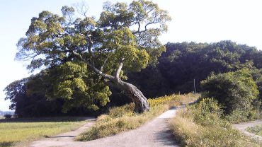 旧・本埜村にはニュータウン計画以前に2つしか小学校がなく、そのうちの一つはこの木の右の道を上がった500mくらい先にある。500mなら近いと思われるかもしれないが、後方の森は見た目より深く鬱蒼としており、昼でも街灯がついているくらい暗い。引っ越してきた15年前、この森を歩いていて向こうからすごい勢いで小動物が走ってきた。猫かと思ったらウサギだった。ここ40年ほど、野生のウサギを見たのはその時だけである。