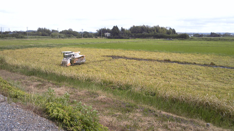もう10月が目前ですが、遅い稲刈りをしている田んぼがありました。