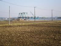 その高台からは、田んぼを突っ切って前方の林まで道が伸びていたのだけれど、その道ごと高台が削られてしまった。下の写真をよく見ると、工事中の橋桁の向こうに高さ20mくらいの丘があって、こちら側にはわずかに残された土の塊がある。この両地点を結ぶ空間に、昨年の撮影スポットが存在したのである。