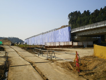 前回撮影地点を下から見上げる。シートのあるあたりが、削られてしまった高台のあった地点。