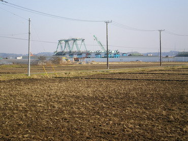 湖岸のサイクリングロードに沿って、南へ進む。500mばかり行ったあたりが渡河地点らしく、新しい橋の骨組みが作ってあり、そこからこちら(印旛村)側に、やはり田んぼを埋め立てて大規模な工事現場となっている。