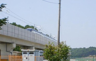 40分以上待ったけれど来ない。奥さんが公園で遊んでいた若いお母さんとお話ししている間に、仕事の電話が鳴ってのんびりしていられなくなった。仕方ないなあと帰りかけたら、いきなり轟音。待ちに待った試運転車だが、カメラを出すのが遅れたのでやっと撮れたのが下の写真。