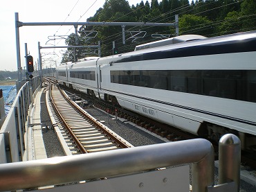 成田湯川駅からすぐのトンネルは新高速唯一のもので、いったん掘削して工事してから埋め戻してトンネルにしたとのことである。トンネルの中は、風が抜けて寒い。トンネルを抜けてしばらくカーブを進むと、はるか彼方まで一直線の部分。ここは最高時速160km/hでの運転区間で、印旛沼沿いを走る。