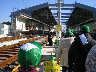 先行グループの進み具合により、時々ストップする。報道関係の人も結構いて、参加者にインタビューしたりしている。ところどころでヘルメットをかぶった工事関係の方が説明してくれる。この線路は新幹線規格で、レールは溶接で継ぎ目がないこと、枕木は現在では木ではなくコンクリだが、それでも枕木と呼ぶことなど、聞かなければ分からないことである。