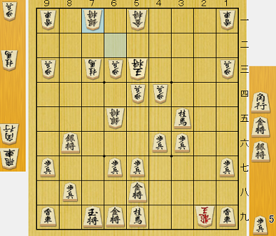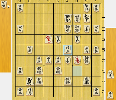 解説席ではもっぱら7六歩から8五飛、さらに8六歩と打ったら飛車がどうするかという見解だったが、7七に空間ができない分、桂で追った方が守りが堅い。飛車の逃げ場所によっては、5五に跳ぶ狙いもある。