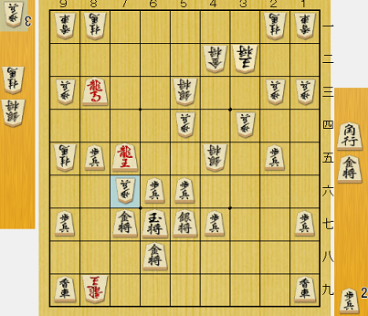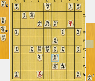 AIの推奨は金で取る手で、以下後手は銀を逃げ、先手は竜を敵陣に侵入させてまだ長い勝負ながら、評価値的には60%:40%で先手に振れていた。玉で取った結果、△6四桂▲6五玉△7三歩と進み、入玉と竜の侵入を両方防がれてしまった。