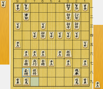 そして下図となる。ここまで攻撃の陣形は双方ほぼ変わらないのに、守備は先手が8八に玉を囲っているのに対し、後手はまだ3一にいる。玉を2二に入れるには単純計算で2手必要だが、その場合角は1三に動かさなければならず窮屈だ。