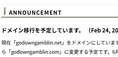 現在の倉庫を「godowngamblin.com」に移し、6月まで並行稼働し、「.net」は継続しないで解約する。そうすれば移行もスムーズで、お名前.comとの縁も切れる。残念なのはせっかくgoogle検索で入ってくる人が増えたのに、また最初からになってしまうことである。