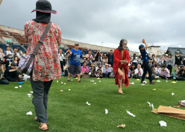 曇り空の函館千代台陸上競技場に、ギリヤーク師登場。「やっぱり函館は暖かいね」