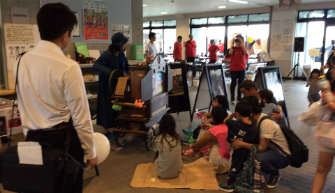 抽選会が終わると、「手回しオルガンの演奏があります」と場内放送があり、スタンド下に向かう。すでに何人かの子供達がオルガンの前で待機している。ちょうど通路にあたってしまって狭いので、函館バスのミニカーを売っているブースの横で拝見させていただいた。