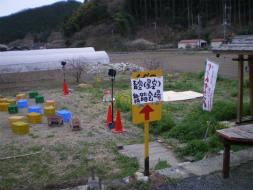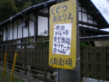 鹿沼市街から古峰ヶ原街道に入り、山の方向に向かう。WEBで調べたところによると、会場は農産物直売所から脇道に入った先にある。直売所を見逃さないよう注意しながら走ると、案の定、直売所はごく小さな小屋掛けで、あやうく通り過ぎてしまうところだった。この先の道は狭くなるが、舗装はされていたのでちょっと安心する。グランドの前の建物あたりにひと気があるので近づいてみると、会場であるくぐつ・あとりえであった。