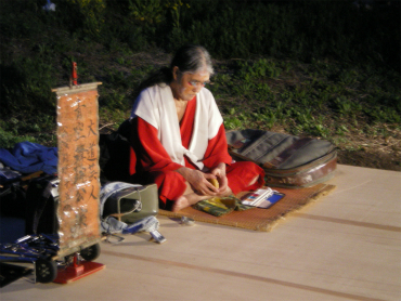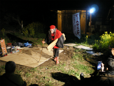 午後6時前、控え部屋を通ってギリヤーク師登場。舞台となったアトリエ前の畑にはベニヤ板が敷かれているが、そこまでの地面にでこぼこがあってカートがなかなか進まない。それと、例のバケツ(水をかぶるやつ)が置いてある場所をどこにするかで手間取って、開始は5分ほどずれ込んだ。観衆は50~60人くらい。常連の方はみたところ5~6人で、他は人形劇関係者である。