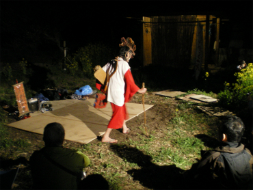 公演会場は、アトリエ裏の畑。木の板が敷かれているのが舞台で、暗くなってからはライトアップされた。山が近いので、かなり冷える。