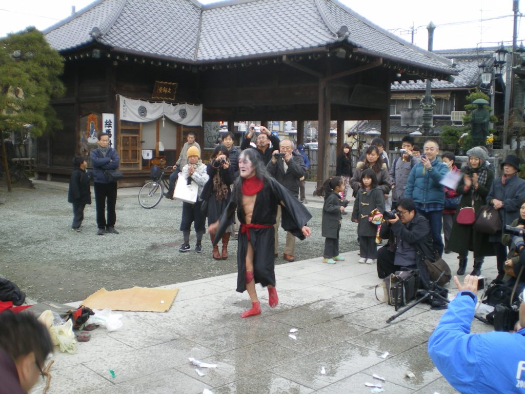 ただ、緊張したためか数珠を手繰る動きが今一つうまく行かず、ぶん回すのを多めにやっていた。クライマックスではそれまでの動きをカバーするためか、すごい勢いで本殿の階段を駆け上がっていき、踊り場で「南無阿弥陀仏」を熱唱、さらに数珠をぶん回す。そして手水鉢のところに置いてあったバケツを持ってきて、例によって頭からかぶってのた打ち回る。最後はきっちりまとめて、今年の締めを飾ったのであった。