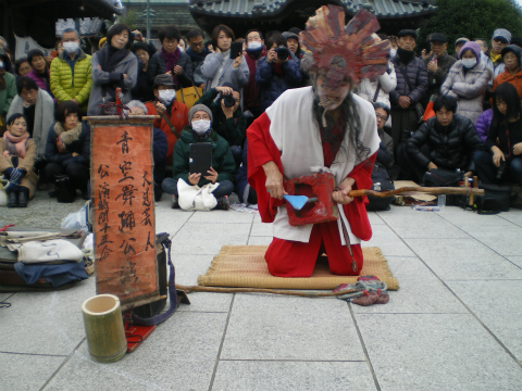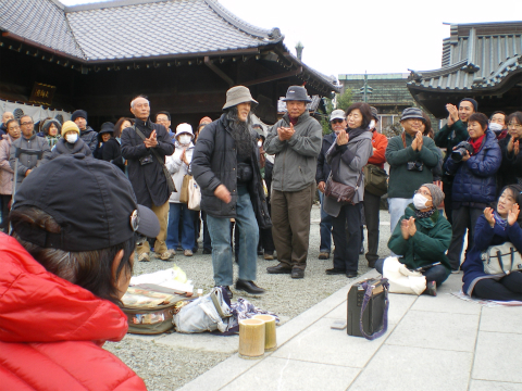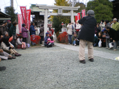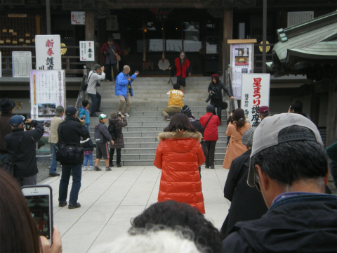 開演10分前に世話人さんからご挨拶があった頃には、すでに人垣は3重4重になっていた。そして、公演スペース真横にあるお稲荷さんのあたりまで、人垣が伸びているのには驚いた。後から奥さんが言うことには、「後ろの人垣のおかげでだんだん暖かくなってきた」というくらいで、すでに目の子で200人は超えていたと思う。