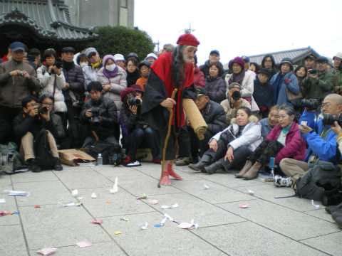 その後、本堂から90°横に位置しているお稲荷さんのところまでダッシュ、両手を上げてアピールした。観客はもちろん拍手喝采である。観客はいつもの川越公演よりもかなり多く、師匠を囲む人垣はお稲荷さんのところまで伸びている。普通にお参りの人が来ていたら、本堂まで行くのにずっと大回りしなくてはたどり着かない。ギリヤーク師の貸切り状態である。