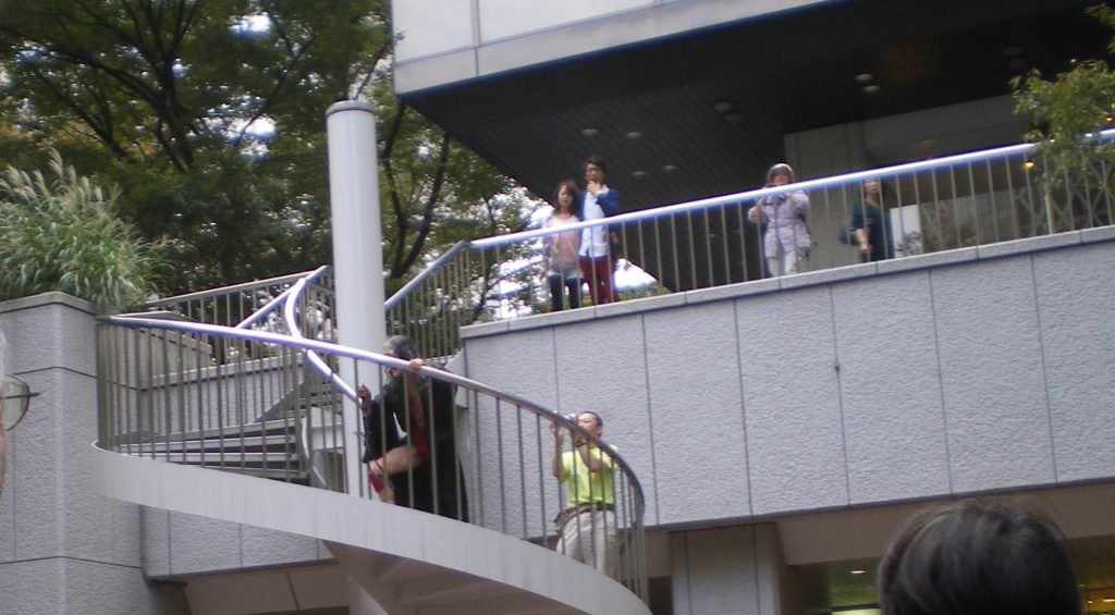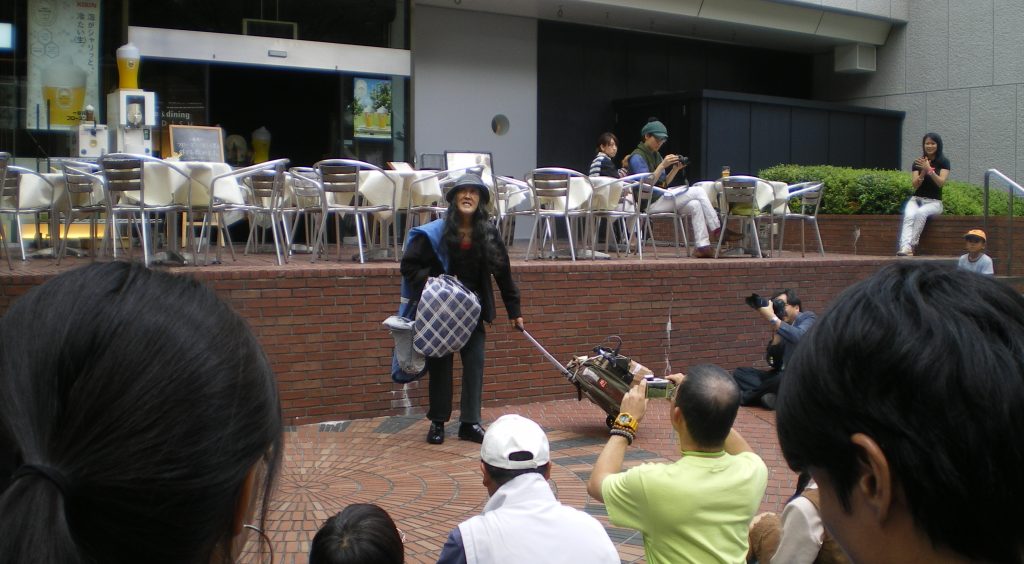 定時の2時を2、3分回ってから、スターバックス方向からギリヤーク師が登場した。まさかスタバにいた訳でもあるまいが、ちょっとうれしそうに見える。例によってカートにトランクとカセットレコーダー、スピーカーを乗せ、茣蓙などの入った包みを抱えて現れた。足下を見ると、革靴が新しい。新調したのだろうか。