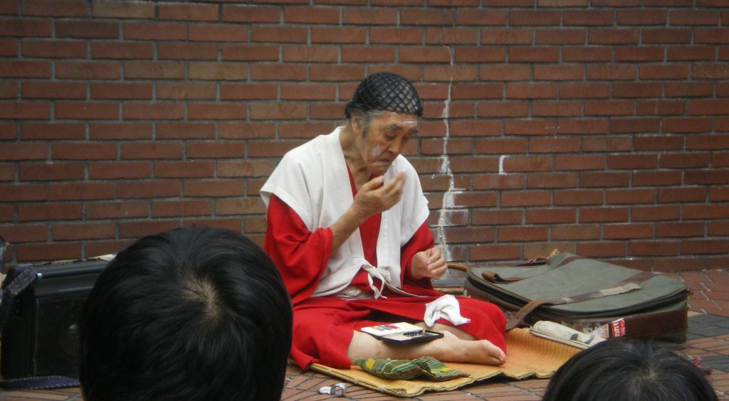 久しぶりの公演のためか、動きがどうもぎこちない。本人は、「ふんどしが緩くて・・・」などと言い訳していたけれど、何回も羽織や被り物の紐を結び直していたところをみると、あまり体調はよくないように見えた。それでも、長年続けて来た大道芸・青空舞踊の流れは体に染みついているようで、身支度、道具の配置、化粧とゆっくりながらこなしていく。