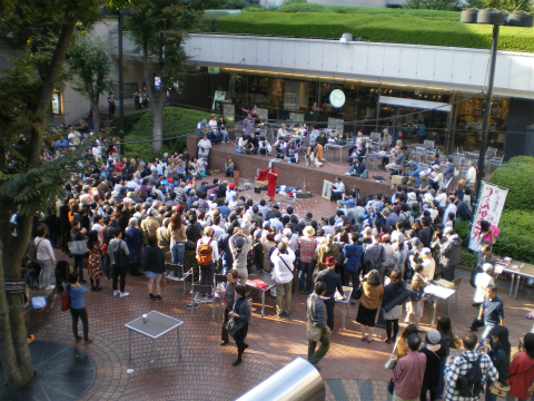 私のつたない体験上、これほどの観客が集まったことはなかった。さすがに本場の新宿である。ざっと数えただけで200人以上、公演中は300人近く集まったのではないだろうか。仕方なく、立ち見の二列目に場所を取る。前に六列くらいある。横浜六角橋も込み合ったけれどあれは場所自体が狭い。なにしろ今回は三井ビル55広場なのである。