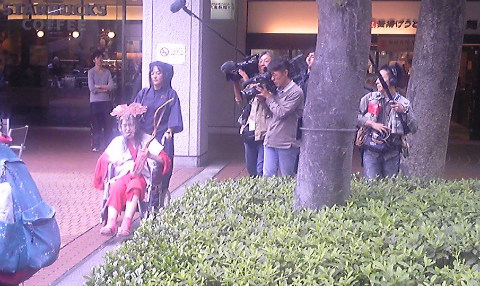 車椅子に乗り、じょんがら一代の衣装でギリヤーク師が舞台へ進む。後にこうした撮影陣がいるのは、あまり見たことがない。
