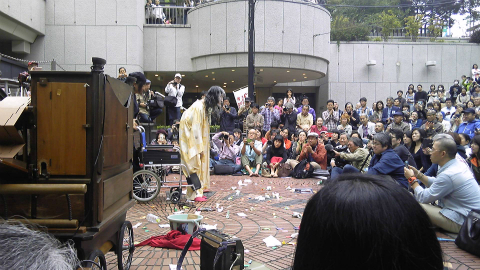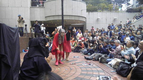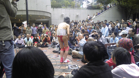 さて、三井ビル55広場に着いた。30分前だというに、もう100人以上集まっていて、椅子は3重くらいに並べられている。それは昨年と同じなのだが、何だかいろいろと様子が違う。いつもは無造作に投げられているギリヤーク師の公演写真がガムテープで壁や地面に貼られ、パンフレットも重しを付けて置かれている。