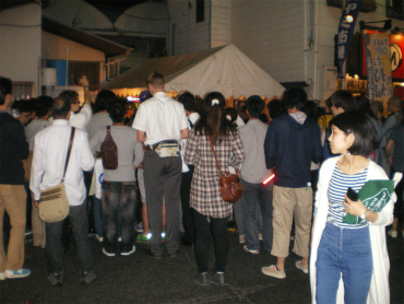 表通りの2ヵ所でダンスショー、路地内の広場と空き店舗らしき中でライブをやっている。何ヵ所かで酒とかビール、から揚げ、春巻き類を売っているので、ニンニクの匂いもしてくる。交通整理をしていた大学生(近くの神奈川大学が商店街活性化のため参加しているらしい)にギリヤークの公演場所について聞いたところ、少し先の人が集まっているところだという。