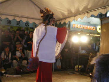 後からギリヤーク師は、「さっきは踊りながら息ができなくなっちゃって。こんなことは初めて」と言っていた。路面も堅いし、夜も遅い。私だって足が痛むのだから、師匠はもっと痛いだろう。調子が悪いのに夜の公演はどうなのかなあ、と思う。大道芸一筋の師匠は、そんな同情はされたくないだろうけれど。
