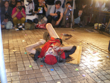 この日は数珠を2本用意。それを振り回すのだが、観客までの距離が短いのでやっぱりやりにくそうだ。そんなこんなで、かなり早いタイミングで人垣をかき分けて道路側に出た。待つことしばし、いつものバケツを持って再登場。そして例によって頭から水をかぶる。そして、この日最初に持ち込んだペットボトルのコーラ(普段は水なのだが)もブン撒く。「日本一!」「ギリヤーク!」の掛け声と、投げ銭が宙を舞う。