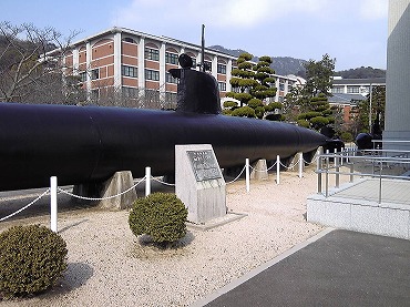 真珠湾攻撃に使用された特殊潜航艇。説明書きによると、昭和35年に米軍により海底から引き上げられ、ハワイから日本までは自衛隊艦艇により輸送運ばれたそうです。後方は学生館(宿舎)。こちらは見学できません。